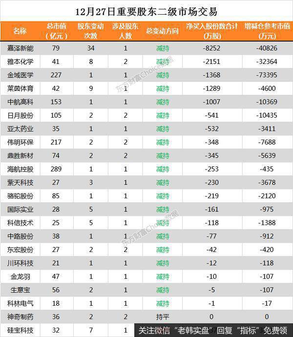 12月27日,两市共有22家公司公告进行重要股东二级市场交易。其中嘉泽新能净减持8252万股,减仓参考市值为40826万元。