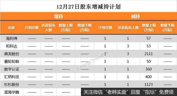 12月27日,两市共有8家公司公告股东减持计划,包括鼎龙股份、杉杉股份等。