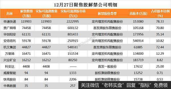 12月27日,两市共有11家公司限售股解禁,具体解禁公司包括申通快递、贵广网络、安信信托等。其中申通快递解禁可流通股数量为119903万股,占其总股本比例为78.33%。