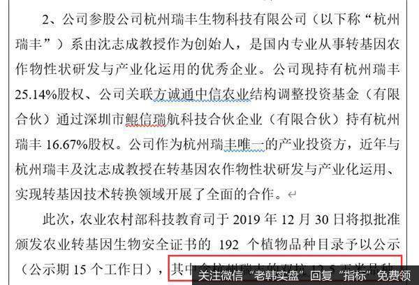 隆平高科称,公司作为杭州瑞丰唯一的产业投资方,近年与杭州瑞丰及沈志成教授在转基因农作物性状研发与产业化运用、实现转基因技术转换领域开展了全面的合作。杭州瑞丰系由沈志成教授作为创始人,是国内专业从事转基因农作物性状研发与产业化运用的优秀企业。