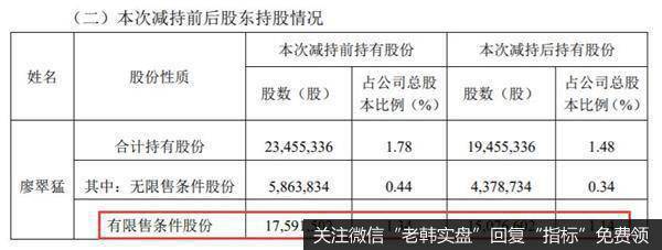 公告显示,廖翠猛所获发行股份购买资产股份于2017年1月11日解除限售,因高级管理人员身份根据相关法律规定每年减持股份不超过所持股份的25%;上述减持计划实施完成后,廖翠猛自公司2018年度报告披露之日起所减持股份总数未超过其所持有公司股份总数的20%。