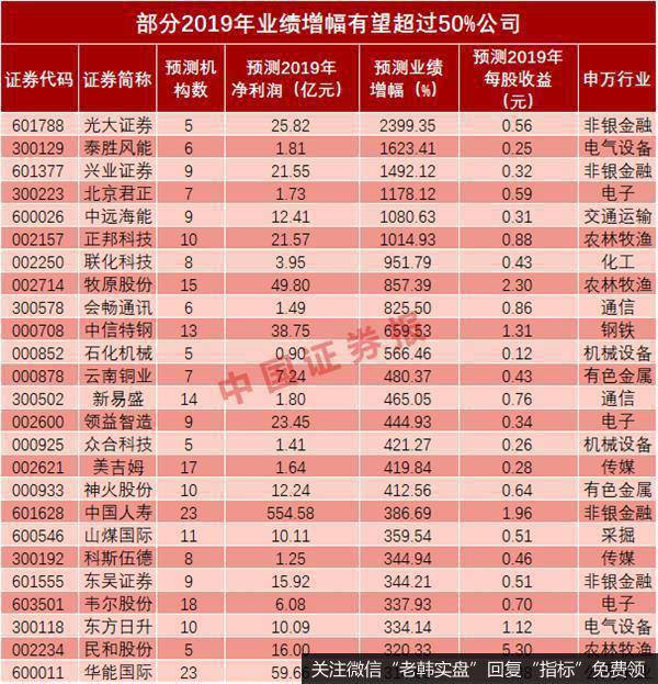 光大证券、泰胜风能、兴业证券、北京君正、中远海能、正邦科技等是机构预测净利润增幅较高的公司,2019年均有望实现10倍以上业绩增长。联化科技、牧原股份、会畅通讯、中信特钢、石化机械2019年业绩增长也有望超过5倍以上。