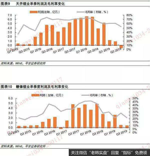 通过单季利润以及毛利率变化分析,我们可以看到,天齐锂业和赣锋锂业业绩同样受行业周期影响,具有一定的波动性。另一方面,由于财务报表对价格反映有一定滞后性,即产品价格领先于盈利体现,为此,尽管2018年锂盐价格已开始走弱,但企业利润依然处于较好水平,而2019年产品价格下跌充分体现,天齐锂业和赣锋锂业业绩显着恶化。到2019年三季度,天齐锂业、赣锋锂业利润水平已回调至与2015年锂周期上行的起点接近的水平。