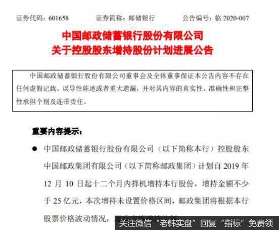 据了解,邮政集团计划自2019年12月10日起十二个月内择机增持邮储银行股份,增持金额不少于25亿元。本次增持未设置价格区间,邮政集团将根据该行股票价格波动情况,逐步实施增持计划。