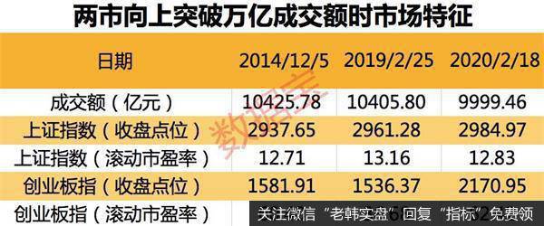 两次行情下,两市成交额首次破万亿元分别发生在2014年12月5日和2019年2月25日,上证指数的收盘点位分别为2937点和2961点,均处在向3000点发起进攻的前夜。周二上证指数收于2984.97点,距离3000点同样只差临门一脚,大盘所处的位置与前两次具有很强的相似性。