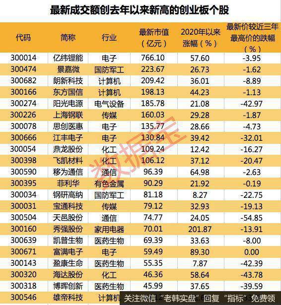 随着创业板成交额创历史新高,一批个股也走出了放量上涨行情。数据宝统计,共有26只非次新创业板个股日成交额创去年以来新高,其中,10股为市值超过100亿元的大中盘股。