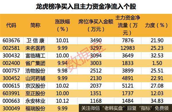 从盘口资金流向来看,主力资金净流入超千万且龙虎榜净买入个股共有14只,其中未名医药、卫信康、人民同泰等个股资金净流入金额最大。净流入力度最大的个股有人民同泰、永安林业、富临精工,净流入力度分别为49.13%、34.83%、32.53%。