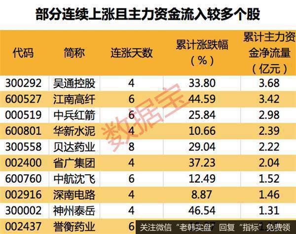 值得注意的是,146只连续上涨个股中,10只个股期间主力资金累计净流入超过亿元。其中,累计资金流入最多的为吴通控股,主力资金累计流入3.68亿元。