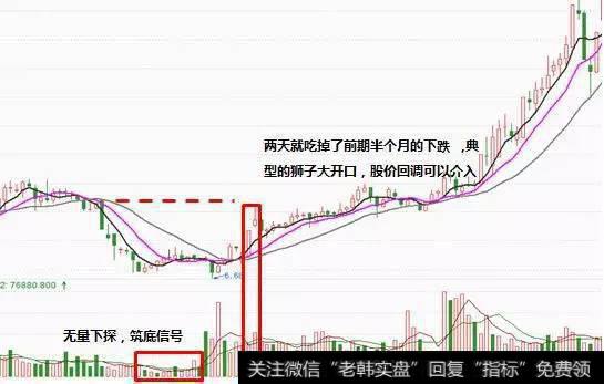“狮子大开口”这是一种很经典的短线买入信号,如图。在经过长期的下跌后,出现横盘震荡最后出现一个长阳,一举挽回前期下跌的指数,确定后期大涨的行情。