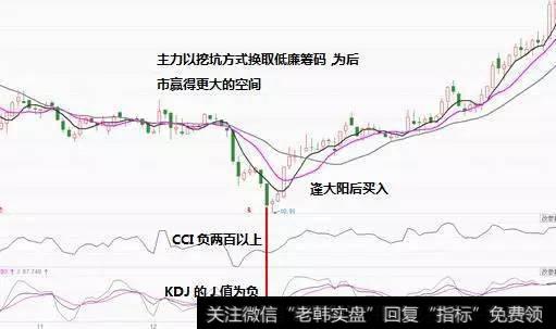特征:股价在箱体震荡盘整后或是在上涨洗盘出现急速大阴或串阴线下探10%以上,同时KDJ、CCI负值,超卖现象。