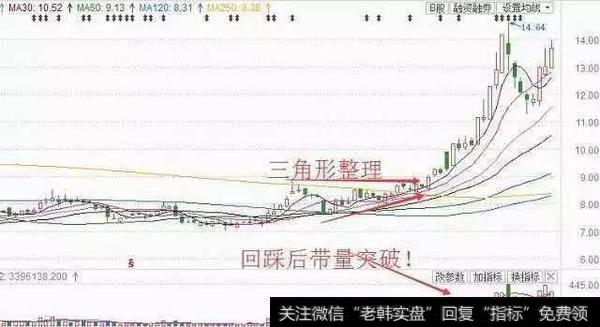 该图形是主力骗取散户筹码最爱用的手段。一定时期内,股价每上涨到高点变遭遇抛压,跌一段后又止跌反弹。由于筹码越来越少,每次下跌的低点都是逐步抬高,伴随成交量的萎缩。几个来回让股民失去耐心,交筹认输。遇到这种图形,股民要坚定持股,或跟随主力做做波段,底仓不动!