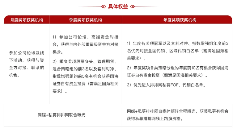 根据赛事规则,以上获奖私募管理人将有机会参加公司论坛及线下活动,获得与资金方对接、联系的机会,以及网媒+私募排排网联合曝光。获奖私募管理人不仅能够与同行交流最新的投资策略,把握市场动态和行业趋势,也能在联合曝光中提高自身品牌知名度和行业影响力,吸引更多投资者和合作伙伴,进而推动业务的发展。