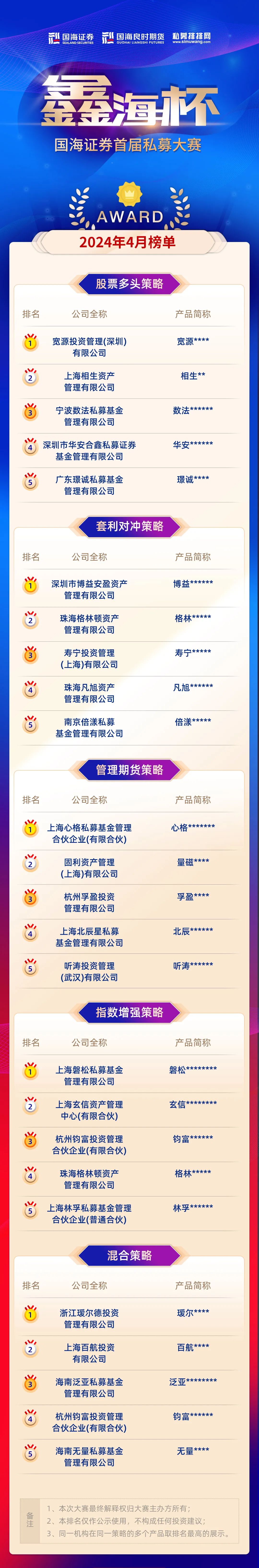 为充分展示各路私募管理人的策略特点和投资实力,大赛根据参赛产品投资策略不同,将参赛产品分为五组,分别为股票多头策略组、套利对冲策略组、管理期货策略组、指数增强策略组以及混合策略组,并于每月公布一次排名情况,按照各策略统一计算排榜。月度、季度排名则按照各策略定量指标分别计算排榜。经过一个月的激烈角逐,国海证券首届“鑫海杯”私募大赛4月获奖名单已正式揭晓。