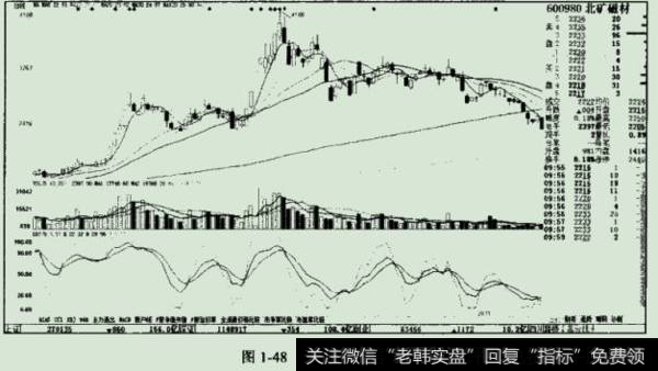 从图1-48中我们可以看到,股价随后走出了一波下跌行情,其实庄家在出货的过程中给了散户好几次出逃的机会。首先在冲高创出本轮上涨行情的新高之后,出现了快速的回落,而且这种回落并非是由于对倒单而导致的,而是由于3w中出现了大量的主动性卖单而导致的.此时就应该立刻卖出才对。这是庄家给IN户们的一次机会.一次“逃命”的机会。