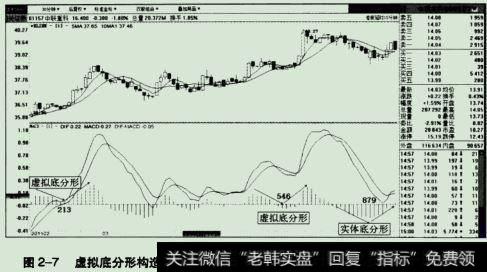 图2一7所示的是中联重科(000157)在上涨过程中所形成的虚拟底分形构造。图中包含了两种虚拟底分形,在图的最左边,虚拟底分形(213)的底部没有绿柱,中间的虚拟底分形(546)下方有绿柱。虚拟顶分形没有绿柱,表示调整的力度较小,有绿柱则表示调整的力度较大。同时我们可以根据虚拟底分形两边红柱的长度判断前后两波上涨的力度。如果后面红柱的长度短于前面红柱的长度,表明后面一波上涨的力度较小,在这种情况下,行情向纵深发展的可能性就比较小。相反,如果后面红柱的长度长于前面红柱的长度,则行情继续深化发展的可能性较大。